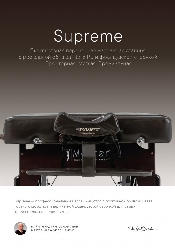 Массажный стол Supreme — это идеальное сочетание простора, комфорта и надёжности в премиальном исполнении. Рабочая поверхность стола имеет размеры: ширина — 71 см, длина — 213 см(с учетом подголовника), что обеспечивает удобство как для клиента, так и для мастера. Высота регулируется в диапазоне от 61 до 86 см, это позволяет адаптировать стол под индивидуальные потребности. Оснащённый матрасом толщиной 7,6 см из многослойной пены Small Cell Foam™ с дополнительным слоем пены с эффектом памяти (Memory Foam), стол обеспечивает высокий уровень комфорта даже во время продолжительных процедур. Прямоугольные углы конструкции способствуют более естественному положению плеч и помогают снять напряжение, а анатомически оформленное лицевое отверстие с заглушкой удобно при работе в ограниченном пространстве. Стол усилен удвоенными Reiki-панелями под ножками, что делает его устойчивым и позволяет мастеру работать в сидячем положении. Дополнительную прочность конструкции обеспечивают соединения Clevis Block™ и стабилизирующая перекладина. При всём этом стол остаётся мобильным — вес составляет всего 17,2 кг, что делает его удобным для транспортировки и выездной работы. Модель выполнена в стильной обивке цвета «шоколад» из износостойкого и экологичного материала Italia PU с декоративной французской строчкой. Обивка устойчива к воздействию масел и влаги, не содержит вредных веществ (CFC-free), и прослужит долго даже при активном использовании. Стол оснащён надёжной системой быстрой установки Auto-Lock™, а ножки снабжены нескользящими и не оставляющими следов накладками, безопасными для любого пола. В комплект входят: регулируемый подголовник Ergonomic Dream, подушка для лица из пены Memory Foam, подвесная полка для рук с мягкой обивкой и удобная сумка-чехол с четырьмя карманами для аксессуаров. Master Massage Supreme — это профессиональный массажный стол, который сочетает в себе эргономику, качество и роскошь, отвечая самым высоким требованиям специалистов.